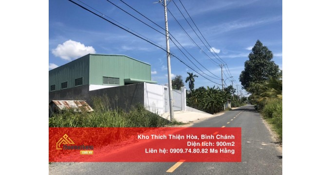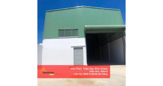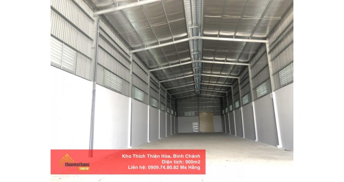Cho thuê kho xưởng 900m2 Thích Thiện Hòa - Bình Chánh tọa lạc tại đường Thích Thiện Hòa, Xã Lê Minh Xuân, huyện Bình Chánh; thuộc khu vực thuận tiện cho việc trung chuyển hàng hóa, gần các tuyến đường lớn giao thông thuận lợi, gần trung tâm, dễ dàng phân phối tiết kiệm thời gian cũng như chi phí xăng xe. Hệ thống kho đạt tiêu chuẩn, có mái cách nhiệt, thoáng, không ngập nước, có hệ thống PCCC đầy đủ, bảo vệ 24/24, camera an ninh.