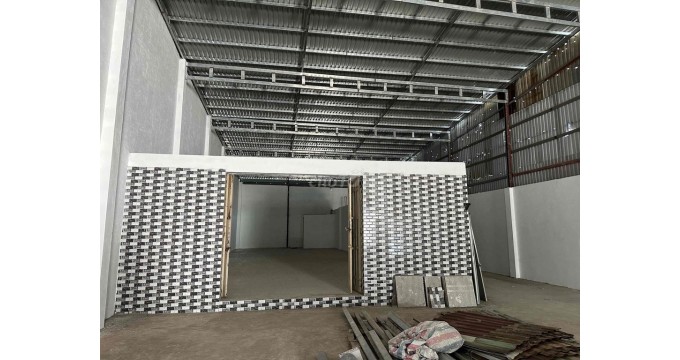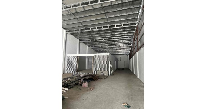 - Kho trệt 660m², kết cấu khung thép tiền chế kiên cố, sàn bê tông chịu lực tốt, trần cao, thoáng mát, thuận tiện cho lưu trữ hàng hóa hoặc bố trí máy móc sản xuất.